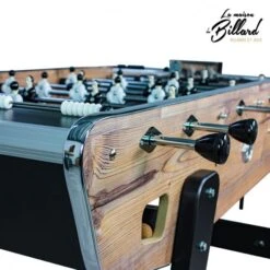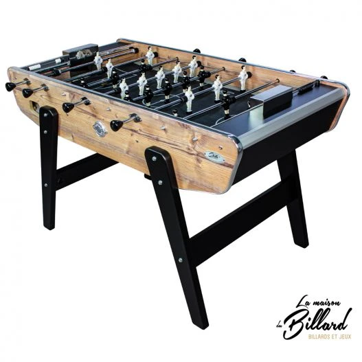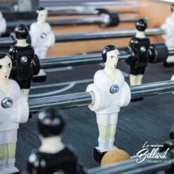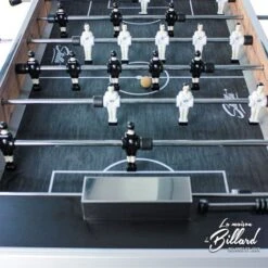 Le problème des baby-foot traditionnels c’est leur imposante caisse qui fait un peu « placard » dans une maison. Alors pour affiner la silhouette on a conçu un modèle bi-color avec des largeurs en noir. Cela paraît anodin, mais c’est ce qui fait toute la différence avec les autres modèles. Le baby est modernisé et les courbes du baby paraissent plus légères. C’est une innovation exclusive à La Maison du Billard, c’est donc un baby que vous ne retrouverez pas chez « Mr et Mme tout le monde ».