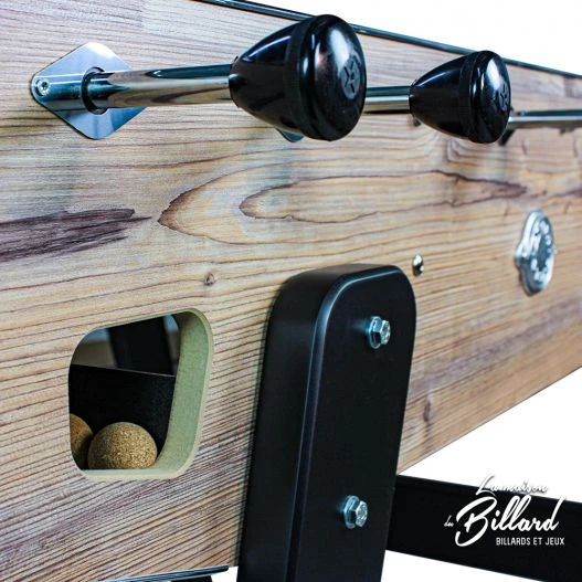 Lorsque nous avons présenté ce baby-foot en magasin, nous avons sondé nos clients. Cette nouvelle version bi-color a rencontré un franc succès. La traditionnelle finition hêtre avait fini par lasser. Vous étiez à la recherche d’un produit avec plus de caché et de modernité. Alors on a opté pour une finition en effet bois vintage. Ce stratifié offre beaucoup plus d’authenticité grâce à son veinage plus prononcé. Concrètement cela donne une finition plus haut de gamme et encore une fois c’est une exclusivité du magasin.
