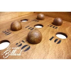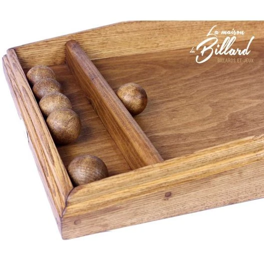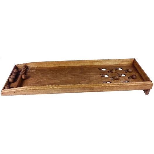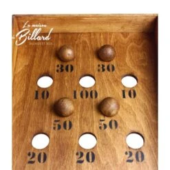 Ce grand jeu en bois se compose d’une large surface de jeu sur laquelle les boules vont rouler. En haut du plateau, on observe 10 trous qu’il va falloir combler à l’aide des billes. En début de partie, vous disposez de 10 boules en bois.