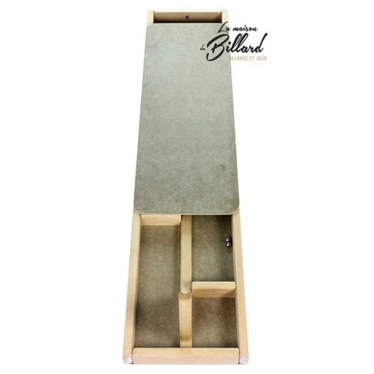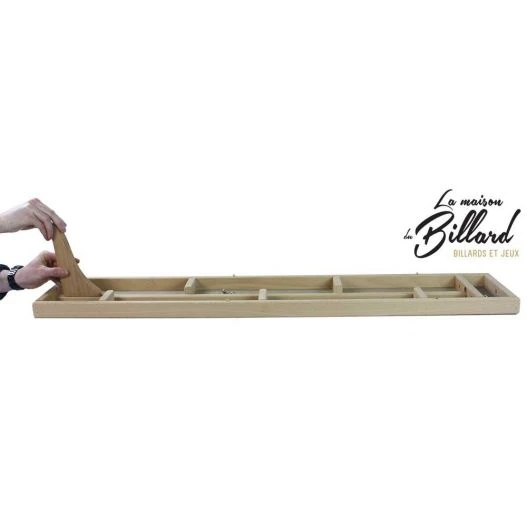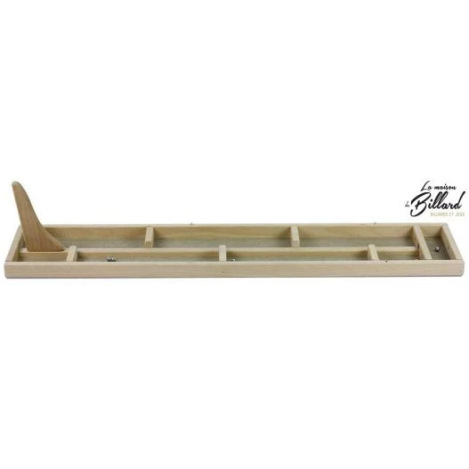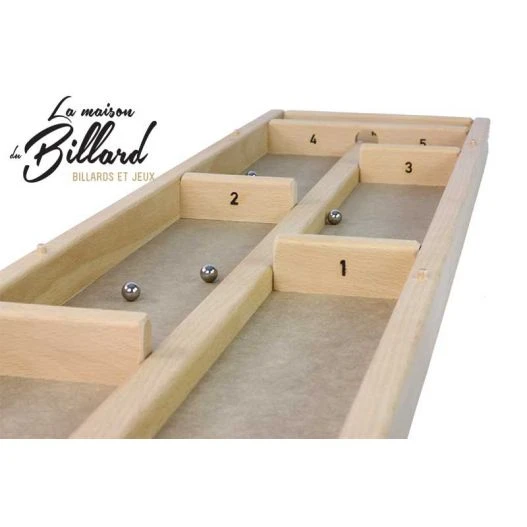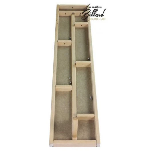 Ce jeu en bois demandera de la prĂ©cision pour orienter la rampe de droite Ă gauche, mais Ă©galement la hauteur de lancement de la bille afin de lui donner plus ou moins de vitesse. RĂ©glez vos paramètres de lancement de la bille et tentez de lui donner la trajectoire qui l’emmènera au bout du jeu. Si la bille chute hors de la poutre avant le trou final, elle marquera plus ou moins de point en fonction de la zone oĂą elle s’arrĂŞte.