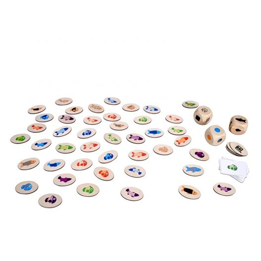 - Dimensions : Poissons 6 x 4 x 2,6 ; Cartes 7,5 x 5,5 x 0,3 ; Dés 3 x 3 x 3 cm