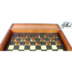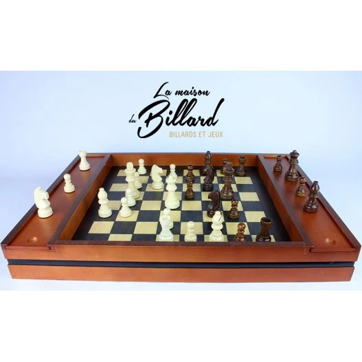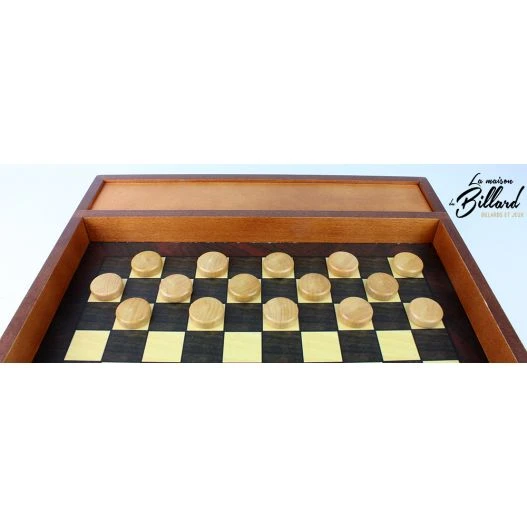 Le double plateau Ă©checs et dames permet Ă©galement de jouer aux dames Anglaises, c’est un jeu qui reprend le principe du jeux de dames Français mais il se joue avec moins de pièces et la pratique de ce jeu se fait sur le plateau d’échecs. (Voir les règles de jeux).