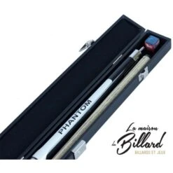 Le pack comprend 1 queue de billard Phantom Noir et blanc, une mallette et une craie bleue.