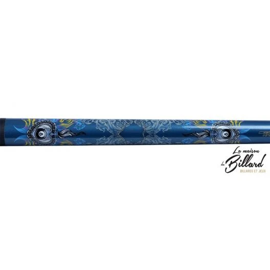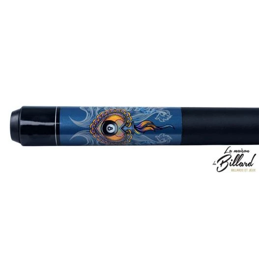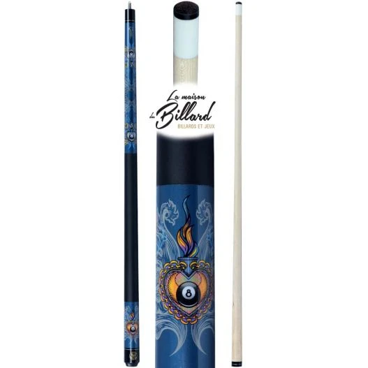 La queue de billard cœur de flamme séduira les amateurs de belles queues américaines, effectivement la peinture bleu pailleté lui donne un côté très élégant, les motifs colorés formant des cœurs renferment une bille N°8 et apportent une touche très moderne.
