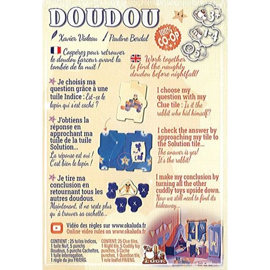 Doudou est un jeu dâenquĂȘte coopĂ©ratif dans lequel les petits dĂ©tectives devront collaborer pour dĂ©busquer le doudou dans sa cachette, avant la tombĂ©e de la nuit !