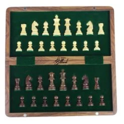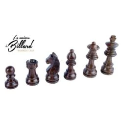 On ne pouvait pas associer ce magnifique plateau d’échecs avec des pièces de qualité moyenne. C’est pourquoi les pièces de couleur claire sont faites en buis et celles foncées sont en palissandre. Elles sont très harmonieuses avec le plateau qui est fait avec les mêmes essences de bois.