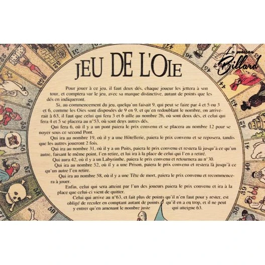 - Règle du jeu de l’oie inscrite sur plateau, afin de l’avoir toujours à portée de main.