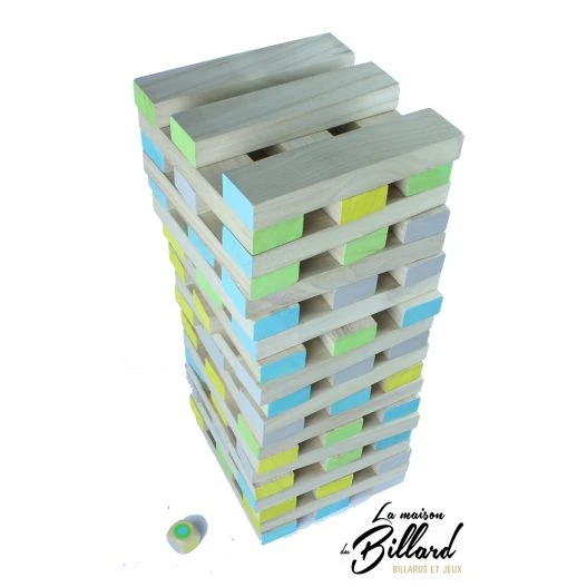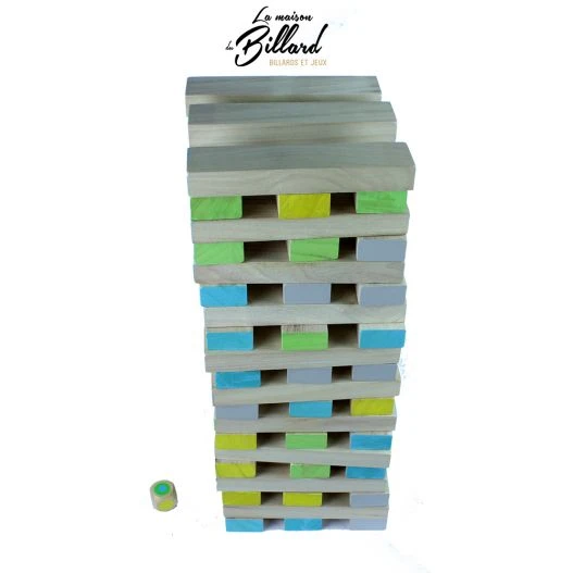 Une deuxième version du jeu Jenga XXL encore plus palpitante consiste à retirer et à re-poser une brique de couleur défini par le jet de dé. Dans cette version il y a une part de hasard qui peu parfois faire basculer la partie !