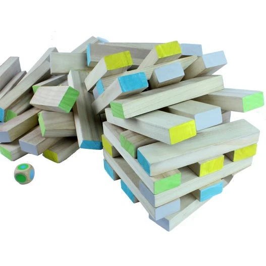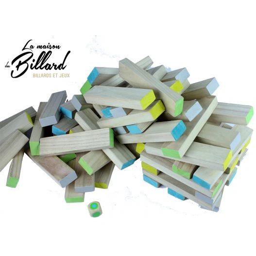 livré avec 60 briques (4,5 x 2,5 x 20 cm) + 1 dé et une règle du jeu.
