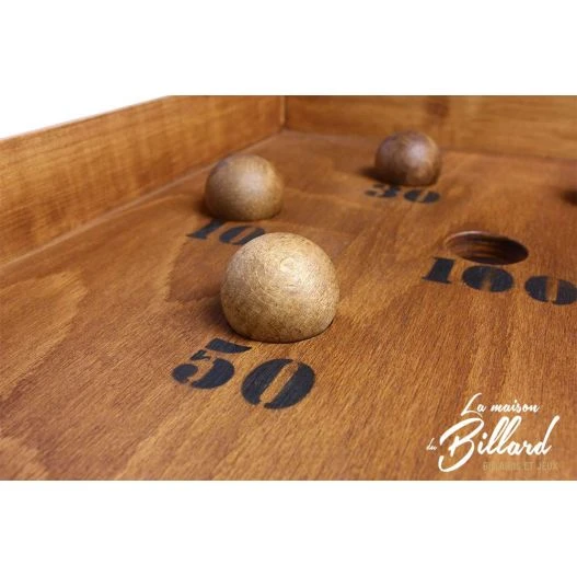 Il faut lancer 10 boules en bois dans les trous sur le plateau.