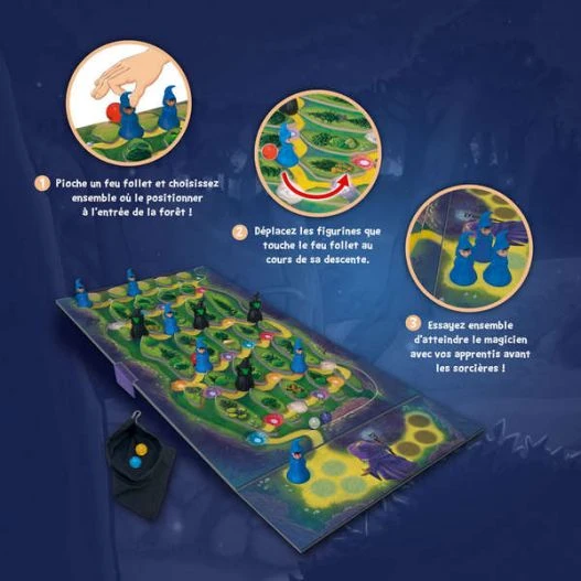 De mĂ©chantes sorcières ont dĂ©cidĂ© de dĂ©rober le cristal magique du grand enchanteur! En tant qu’apprentis, vous devez les en empĂŞcher et rejoindre le bas de la colline avant elles. Suivez les feux follets Ă travers les chemins sinueux de la forĂŞt: Faites descendre les billes en dĂ©plaçant chaque figurine qu’elles touchent vers le point de couleur suivant jusqu’Ă ce que la bille arrive tout en bas. puis on pioche une autre bille et on recommence. Si les apprentis arrivent près de l’enchanteur avant les sorcières, c’est gagnĂ©!