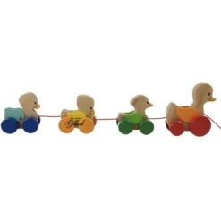 Le canard Ă tirer est Ă©galement très facile Ă utiliser, mĂŞme pour les plus petits. L’enfant peut simplement saisir la maman canard et la tirer en avant pour faire avancer les canetons.
