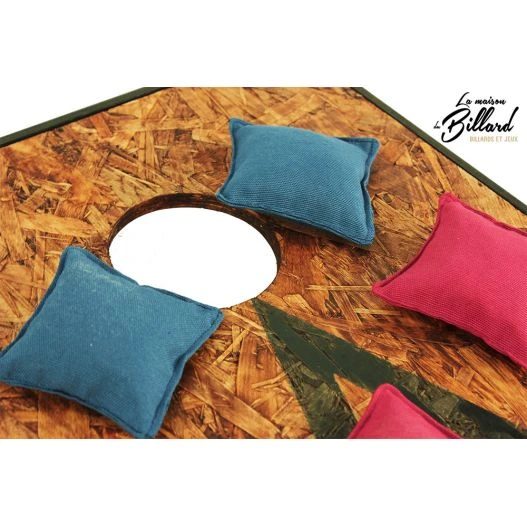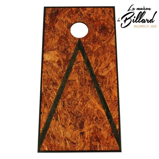 Un cornhole de caractère et aux lignes épurées. Ici le cadre en bois massif est peint en noir et la surface de jeu est teintée pour donner un look vintage, proche des tendances de mobilier industriel. Même si ce jeu traine dans la maison, il apportera un côté déco.