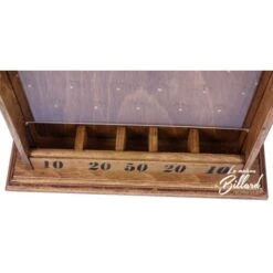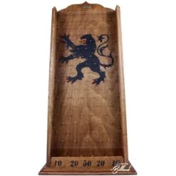 Ce jeu en bois nécessite de nombreuses heures de main-d’œuvre puisque chacun de ses clous est enfoncé à la main. Le lion peint sur le fond du jeu est l’emblème des Flandres.