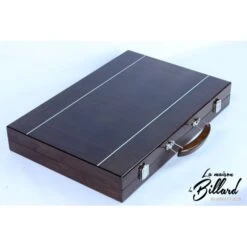Ce magnifique coffret de Backgammon se présente sous forme de valise en bois massif finition laquée et avec des lignes de marqueteries présentes sur les 2 faces de la mallette.
