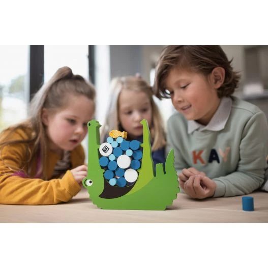 L’effet de groupe est assuré car il se joue jusqu’à 5 joueurs à partir de 5 ans, en mode coopératif ou compétitif : soit ils choisissent d’amener le poisson jusqu’au fond de la bouche du crocodile, soit d’avoir le plus grand nombre de points en prenant les plus grandes bulles (celles valant plus de points).