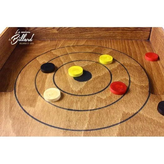 Avec sa piste de 1m20 de long les joueurs devront faire preuve de justesse dans leurs tirs. Votre stratégie de jeu pourra être de vous placer au plus proche du centre de la cible (qui représente le cochonnet) ou alors d’envoyer les pions adverses dans le décor en faisant un carreau.