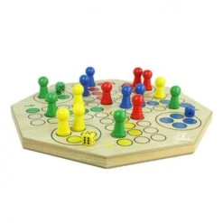 Le jeu des petits chevaux géant est un joli jeu en bois composé d’un plateau, de 16 pions et de 2 dés. Les pions sont peints de 4 couleurs différentes pour différencier les chevaux de chaque joueur. Il en est de même pour les cases de chacune des écuries.