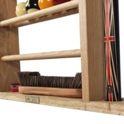 Ce porte queue mural vous permettra de ranger tous types de queues de billard (américaine, US, Anglaise ou Française) et mettra en valeur jusqu’à 2 jeux de billes (en 57 ou en 50, 8 mm) Enfin vous pourrez aussi centrer votre triangle et poser craie et brosse sur la dernière étagère du bas.