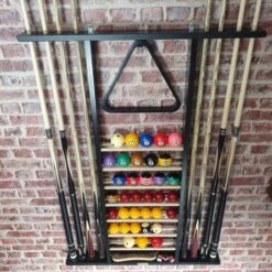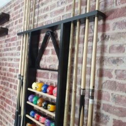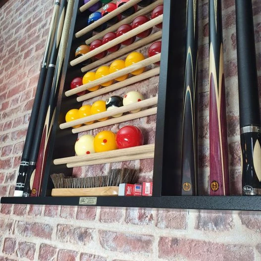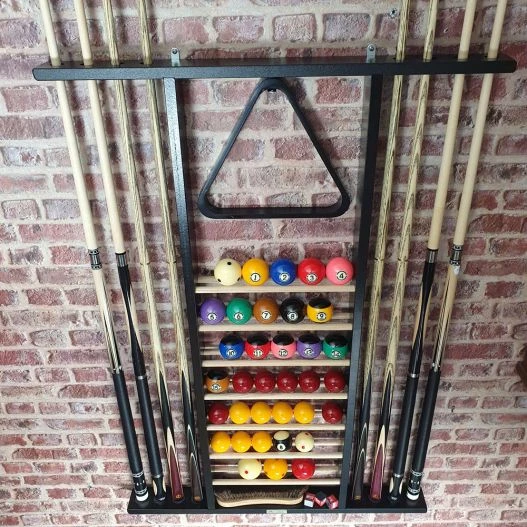 Ce porte-queue mural vous permet de ranger à la verticale 8 queues de billard de 1,20 m à 1,50 m, quel que soit le type de queues. Après chaque partie de billard, vous pourrez également ranger vos billes sur l’échelle centrale, qui permet d’accueillir 2 jeux de billes de 57 mm (le plus gros diamètre pour les billes de billard).