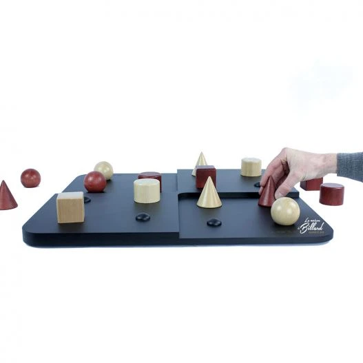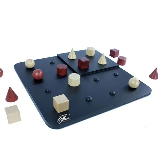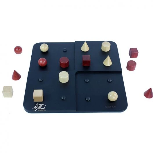 Chaque joueur reçoit 8 pièces de formes différentes (2 sphères, 2 cylindres, 2 cubes et 2 cônes ) et doit en placer une à chaque tour sur un espace vide du plateau. Le premier joueur qui pose la 4eme forme différente dans une ligne, colonne ou zone remporte la partie. Chaque partie est différente et met au défi votre esprit logique et tactique.