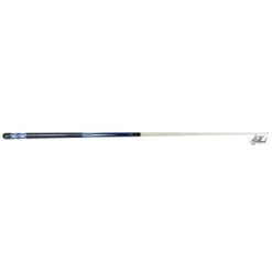 Une queue de billard Carambole Bleue et noire, La couleur bleue sous les graphismes du fĂ»t est donnĂ©e par un bois qui a Ă©tĂ© teintĂ© dans la masse.Â
