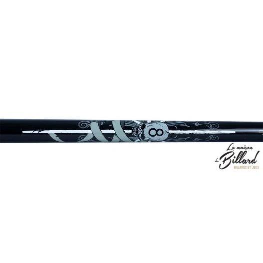 La queue de billard Fantasy Skull est une nouveauté chez La Maison du Billard, Elle plaira beaucoup aux amoureux de dessins gothiques. Effectivement 2 têtes de mort représentant les billes N° 8 du jeu de billard sont dessinées sur la partie haute et basse du fût.