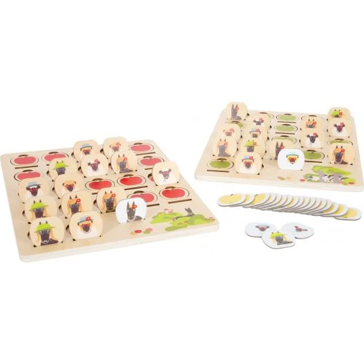 - 2 plateaux en bois, 44 cartes en bois personnages ( 22 rouge, 22 vertes), 22 cartes personnages