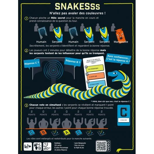 Chaque joueur se voit attribuer un rĂŽle cachĂ© en dĂ©but de tour: Serpent, Mangouste de la vĂ©ritĂ© ou Humain ordinaire. Et on pioche une carte Question. La mangouste rĂ©vĂšle son identitĂ©, on peut lui faire confiance. 2 clans se forment alors: les Serpents qui se reconnaissent en dĂ©but de tour et ont pour objectif d’influencer les autres joueurs vers une mauvaise rĂ©ponse Ă la question. Et les humains Ordinaires et la mangouste, qui eux cherchent Ă trouver la bonne rĂ©ponse. Il y a alors 2mn de discussions et chacun doit voter pour la rĂ©ponse de son choix. Chaque Serpent marque 1 points par mauvaise rĂ©ponse donnĂ©e et chaque humain reçoit 1 point par bonne rĂ©ponse trouvĂ©e. Au tour suivant on redistribue les tokens Personnage et au bout de 6 manches, le joueur qui a le plus de points remporte la victoire!