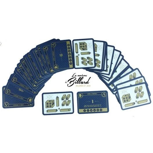 Continuons sur les nombreux points de qualité de ce jeu de société en bois, les cartes bleues et dorées sont trÚs jolies et chaque défi est trÚs clairement solutionné au dos de la carte.