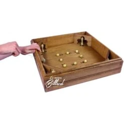 Lancer la toupie Ă l’aide d’une ficelle faire tomber les quilles et chasser les billes de leur trou qui rapportent des scores diffĂ©rents.