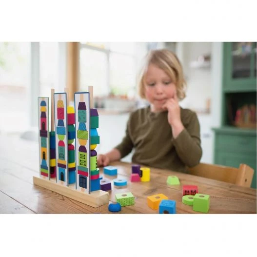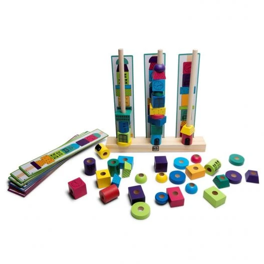 Jeu de tours Ă empiler sur socle de 3 tiges en bois de 28 x 26 cm. On positionne Ă l’arrière du socle des cartes modèles avec l’ordre des blocs colorĂ©s Ă enfiler. L’enfant doit alors reproduire la sĂ©quence formes et couleurs.