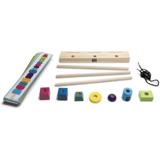 Matériel éducatif qui comprend 1 socle avec 3 tiges en bois, 42 pièces à enfiler multicolores en bois, 1 cordon et 12 cartes modèles.
